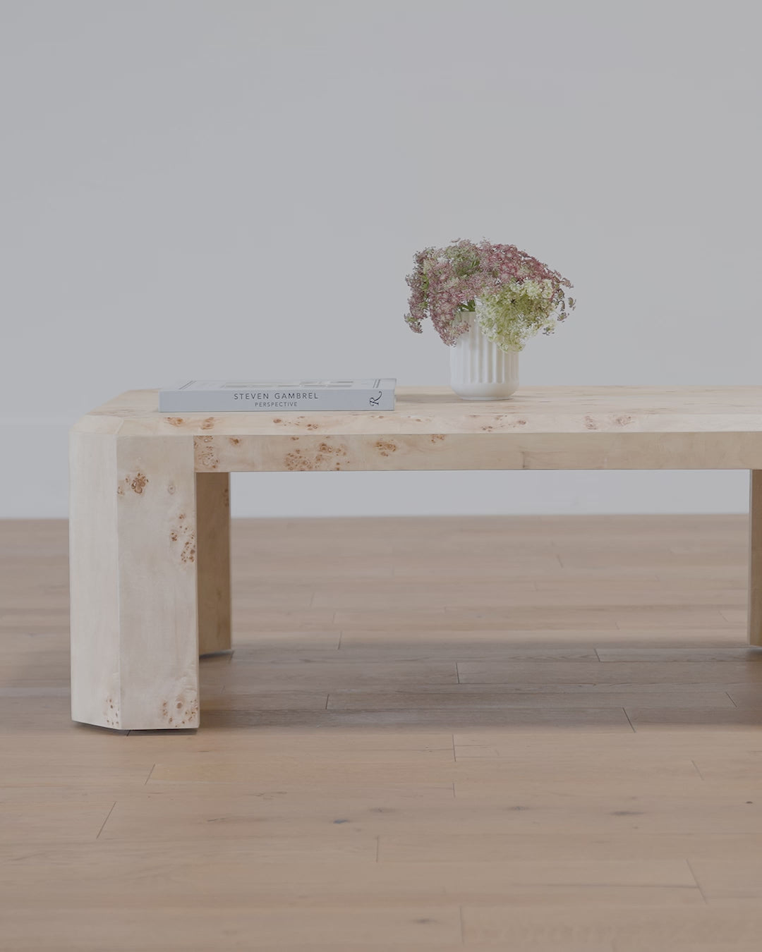 With organic detail and geometric construction, our Rocio Burl Coffee Table elegantly pairs modern style with natural materials. The wide coffee table is made from burl wood with a natural finish, highlighting the unique features and contrasting tones of the wood grain and displaying the table’s vintage-inspired design.
