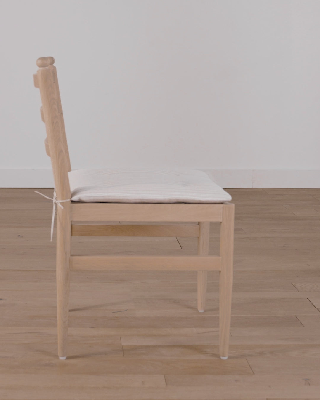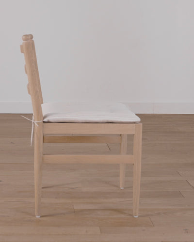 A modern update of a classic oak dining chair, the Romany Dining Chair features unique details within its straightforward design. With a frame made from white oak and a tie-on cushion upholstered in 100% linen, this oak dining chair is a sophisticated yet approachable dining room staple.