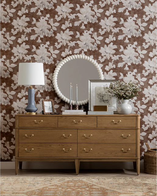 The Edward Dresser in Black Ash with brass knobs provides chic bedroom storage, adorned with a textured lamp, tray, glass jar, framed photos, vase of dried flowers, and two large overlapping art pieces above a patterned rug, by Vendixs The Edward Dresser, in Black Ash, provides stylish bedroom storage with six drawers and round brass handles, by McGee & Co. Shown on a light wood floor against a plain white background.