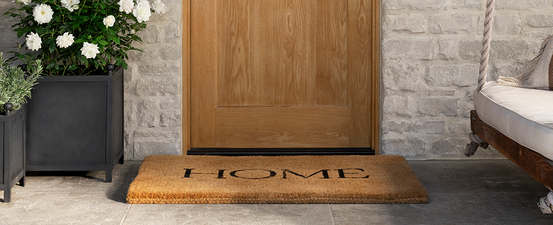 Welcome Doormat with Leaf Border The Welcome Doormat with Leaf Border features a rectangular coir design with Welcome in elegant script at the center, framed by a decorative leaf border on a plain white background, by McGee & Co.