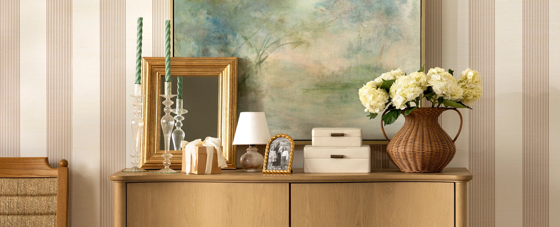 Two Oswald Metal Boxes with a brass finish are stacked against a white background. The smaller box sits centered on the larger one, highlighting their sleek metallic gold color and minimalist design. A brown ceramic vase with two handles holds green hydrangeas on a light wood table beside the Oswald Metal Box, which has a brass finish, and another gold box, set against abstract framed artwork in the background.