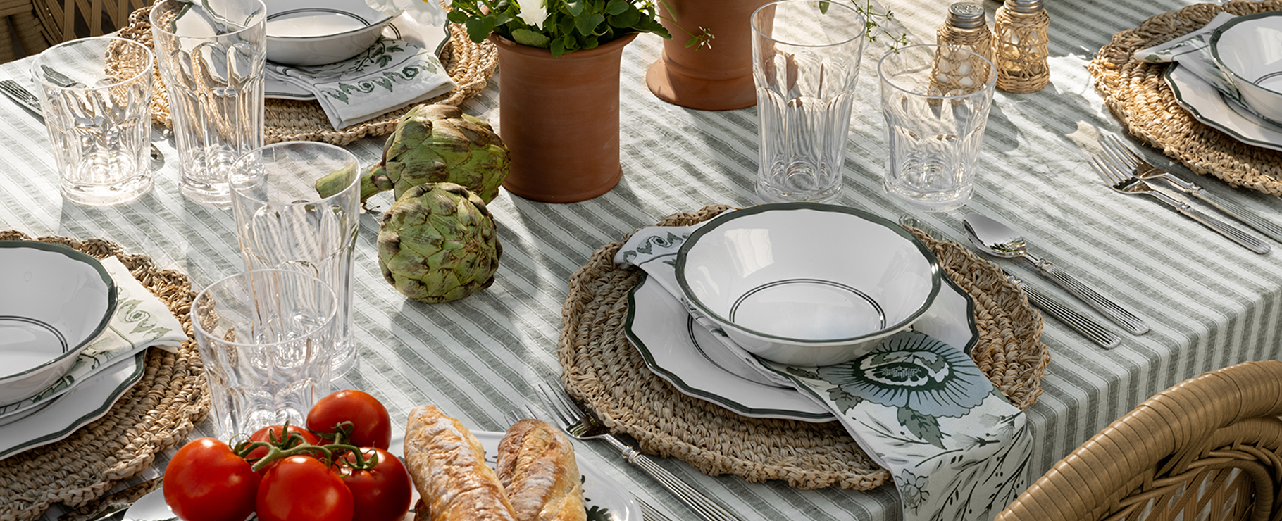 As you shop for outdoor tabletop decor, look for pieces that capture your personal expression. Much like the dining essentials you curate for indoor use, outdoor dining accessories provide an opportunity to infuse your space with personality. Incorporate tablecloth patterns that inspire, outdoor placemat textures that give interest, and dinner plates that set the ambiance. As you methodically curate outdoor dining pieces you love, hosting alfresco gatherings becomes a breeze. This is one of our best tips for hosting—purchase platters, placemats, plates, and glasses you love, so you can easily pull a look together at a moment’s notice.