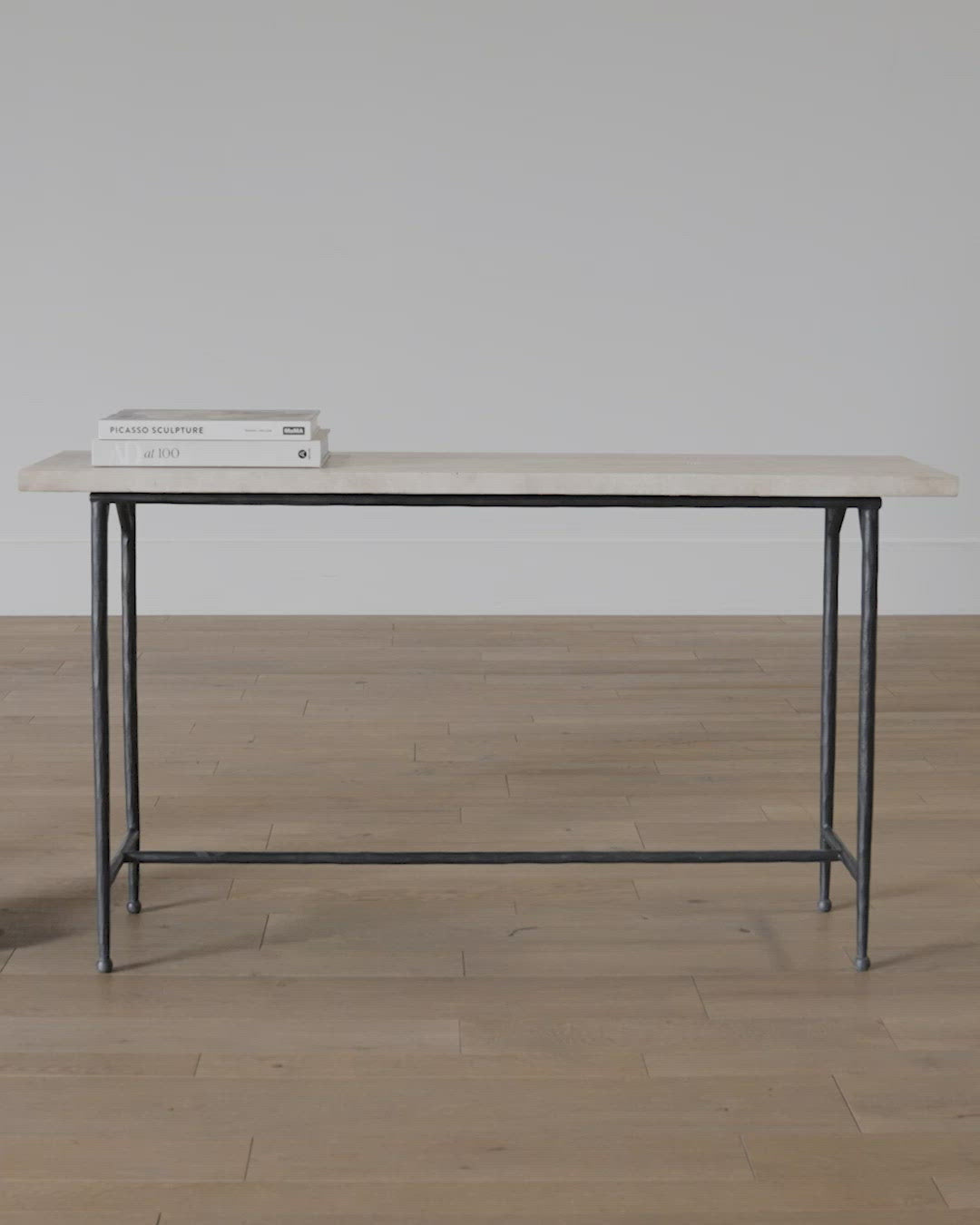 With the organic texture of unfilled travertine stone, the Travertine Console brings both a natural and refined feel to your space. The hand cut slab of travertine sits on a structure of hand forged and hammered iron, highlighting the mastery of materials in its straightforward design. Elegant but subdued, the console table gives a cohesive finish to entryways.