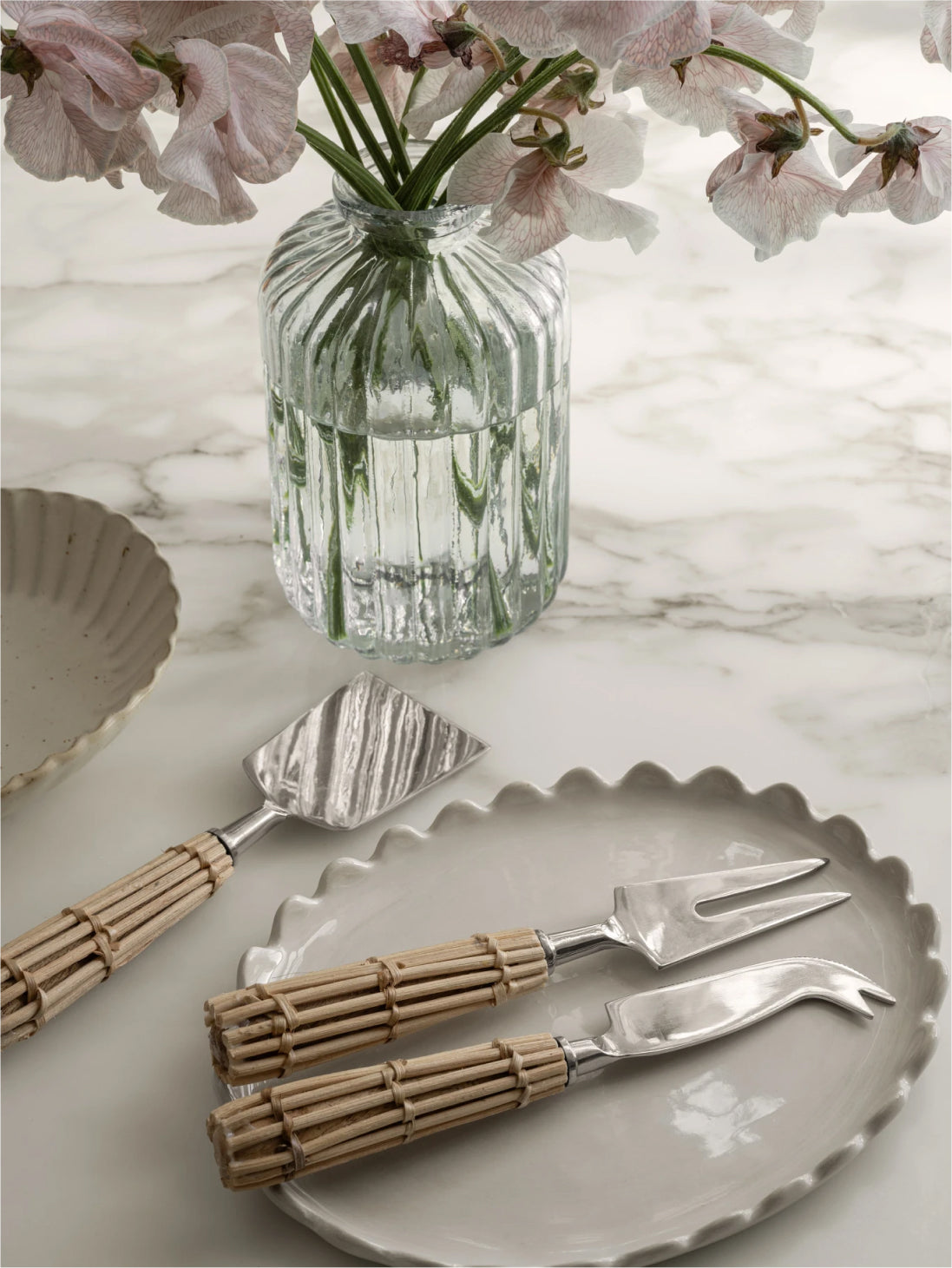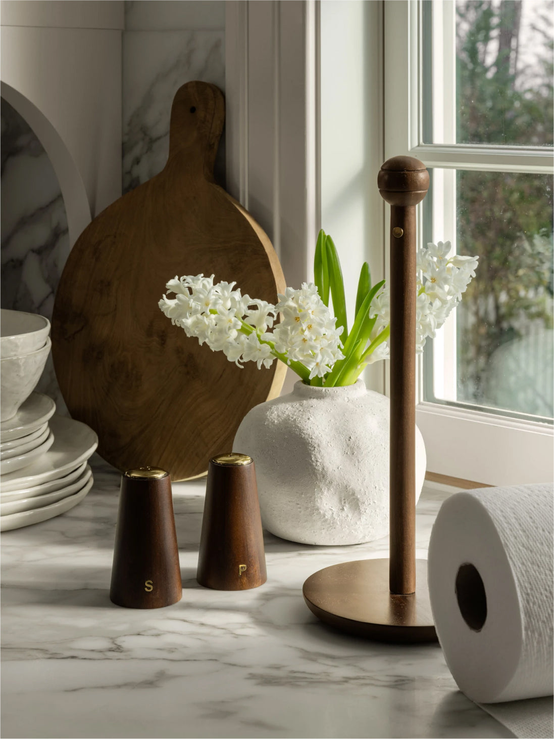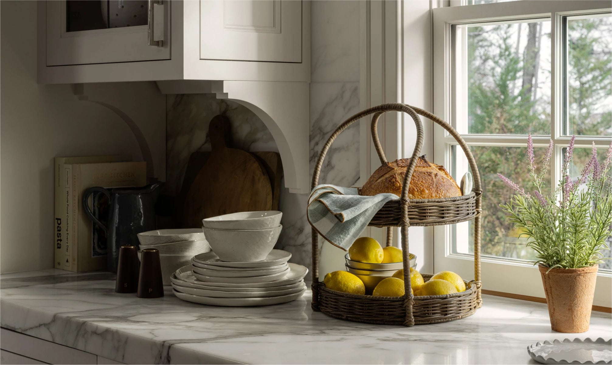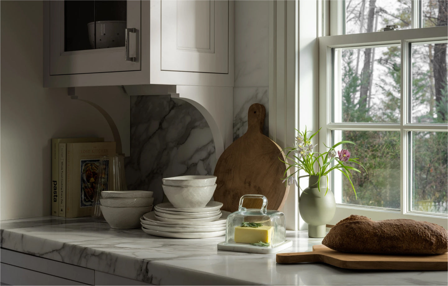 Blend form with function, highlighting the beauty of mixed materials by allowing practical kitchenware to shine in decorative vignettes and using florals and vibrant cookbooks as accent decor.