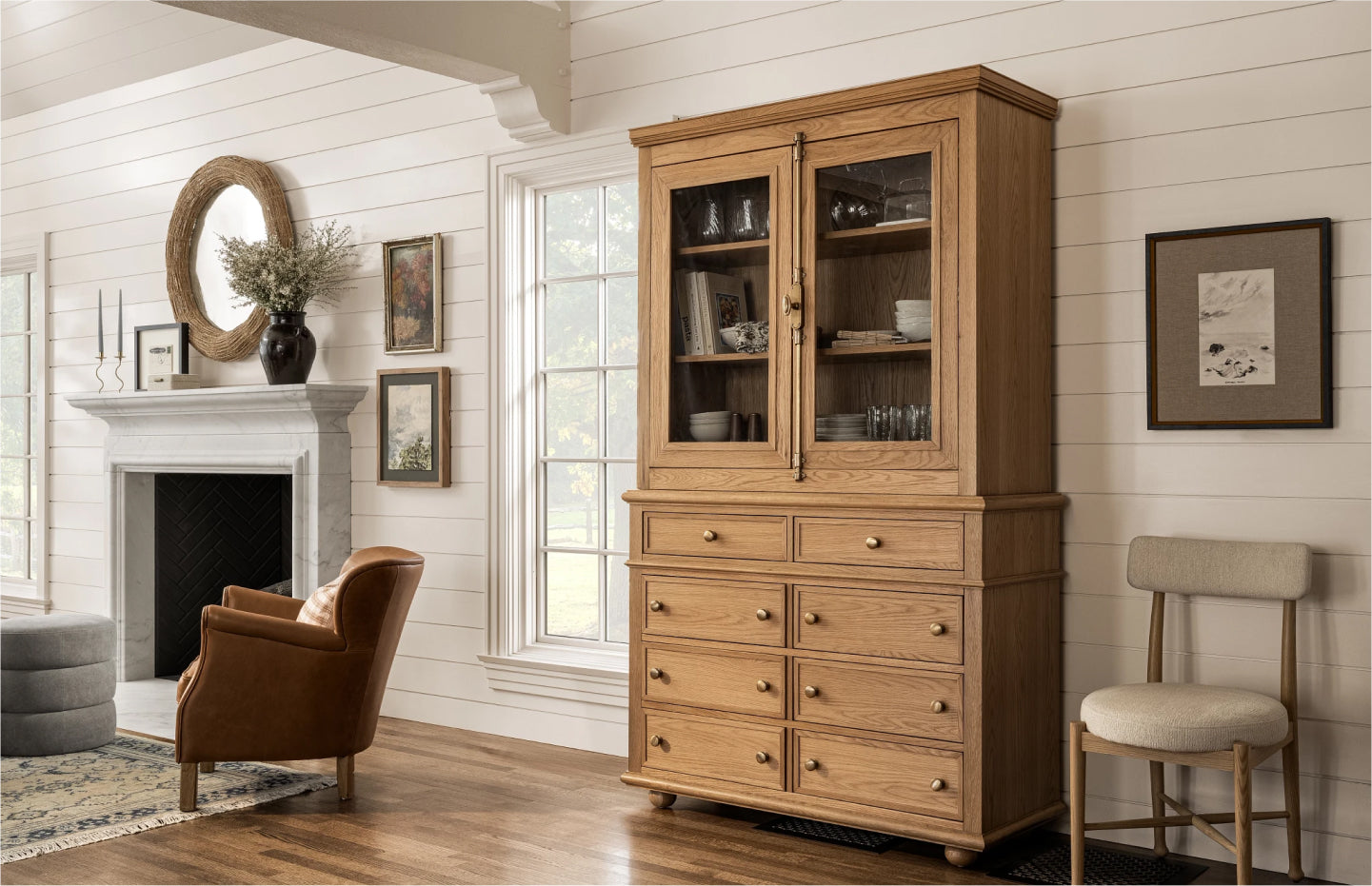 A tall cabinet provides both height and function to a kitchen or dining space, allowing for intentionally collected styling on open shelves or practical storage within drawers.