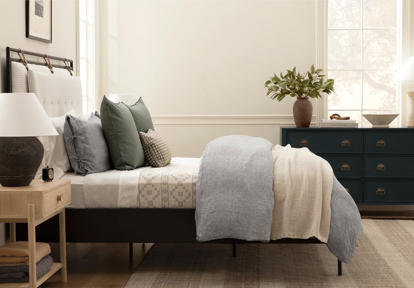 How to Choose Accent PiecesUse accents like throw pillows, blankets, and decorative trays to infuse your personality into the space—layering textures and colors can create visual interest and an inviting warmth. Consider rotating seasonal textiles to keep your bedroom feeling fresh throughout the year—lightweight linens for summer and plush velvets or knits for winter. Don't forget to incorporate plants or greenery to bring life and freshness into the room. For a cohesive look, choose 2-3 decorative objects in varying heights for nightstands and dressers, maintaining enough clear surface for functionality. Shop Pillows & Throws |