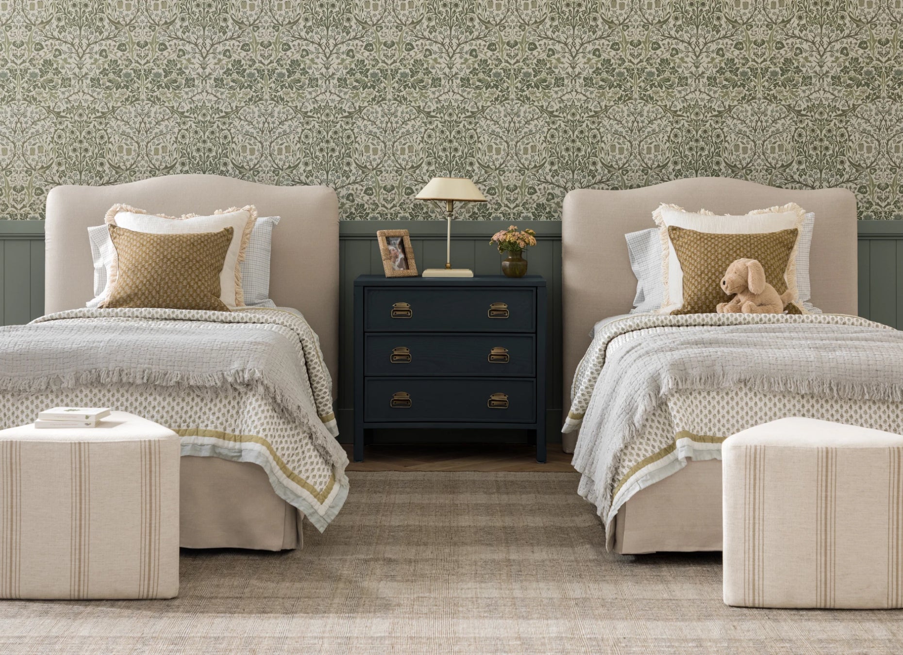 With wallpaper as a backdrop, layer in patterned bedding and textiles to add depth, dimension, and personalization.