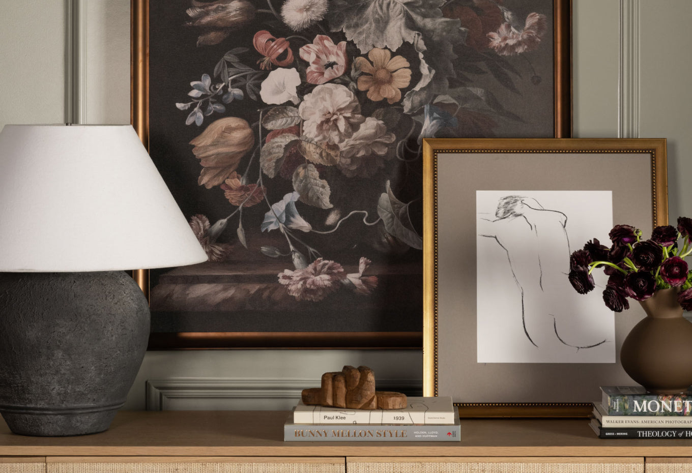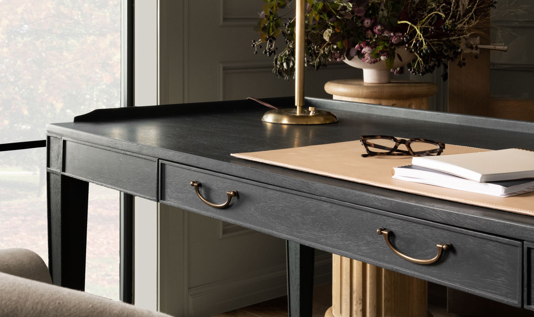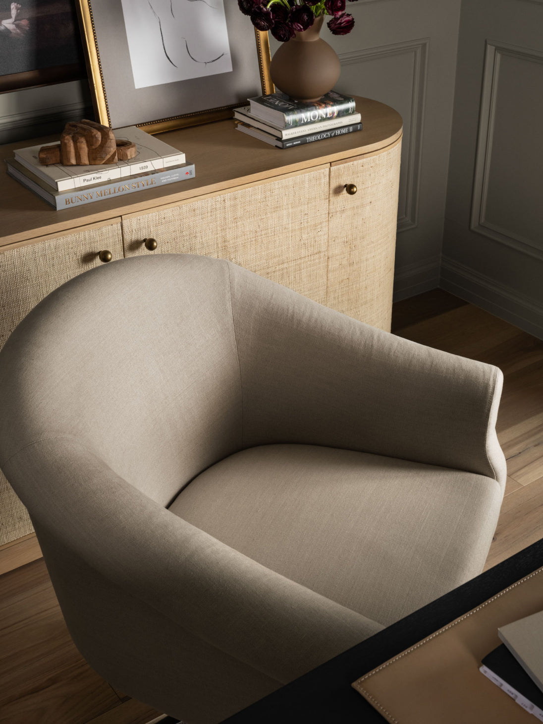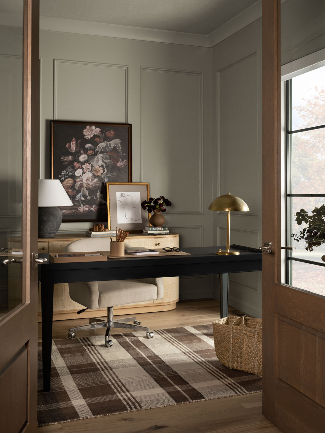Create a sleek but playful home office with a balance of cool tones and organic textures, subtly complemented by bold patterns in artwork and textiles.