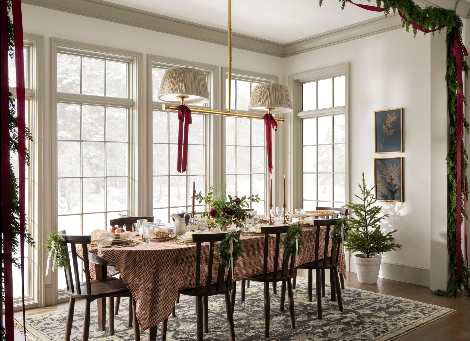 Drape wreaths over chair backs or style mini trees in corners for a fresh holiday touch.