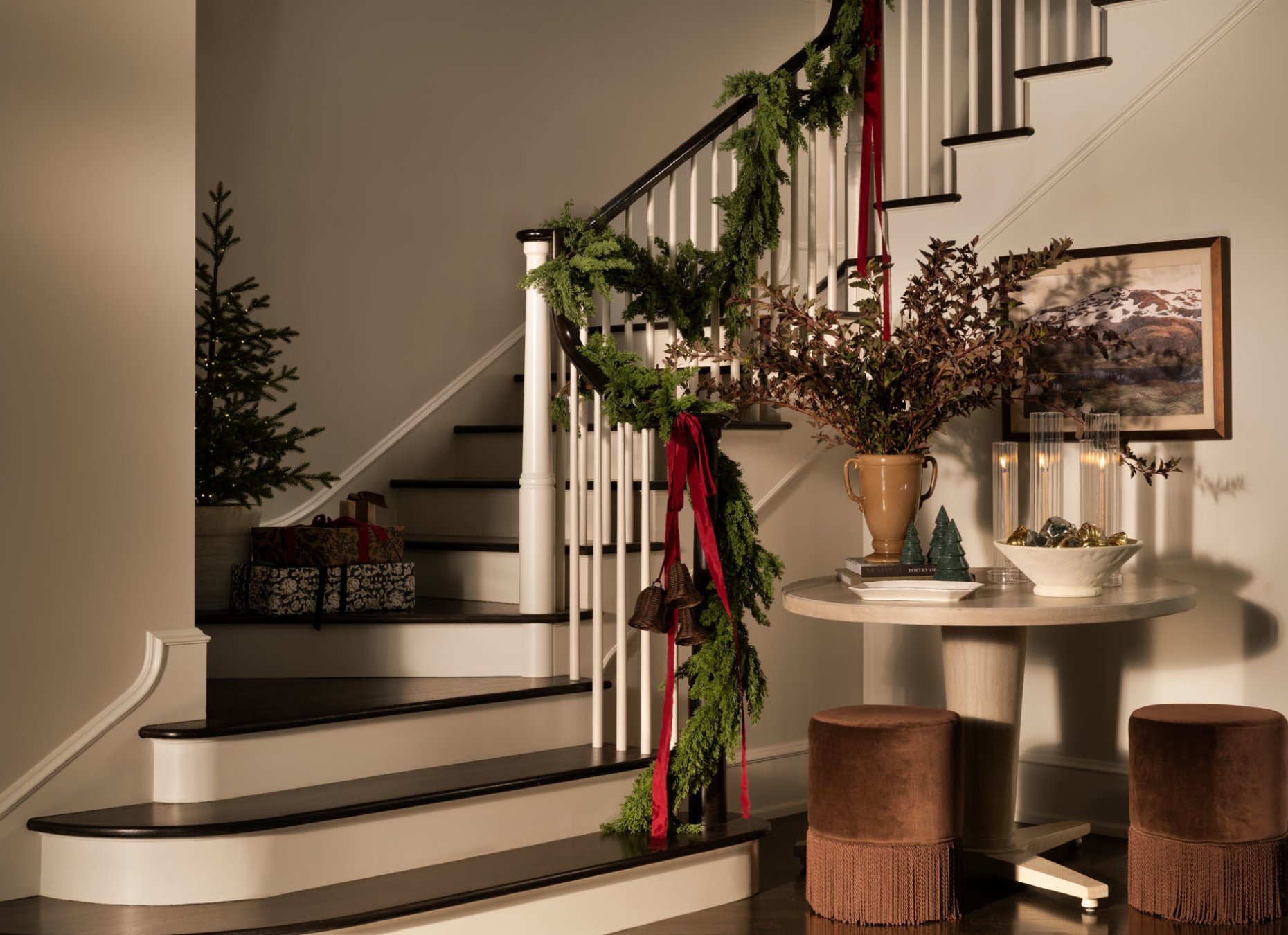 Add texture to every surface with a garland styled on the banister and small potted trees to fill any empty space.