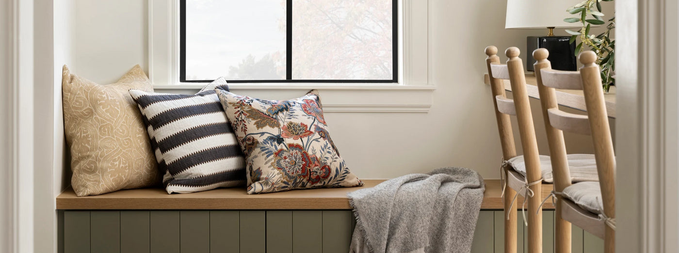 In a seating nook or bench setting, a consistent look can achieve a welcoming feel without overcomplicating the space. Two pillows of a similar size, color palette, texture, or pattern on one side or both will create an elegant and cohesive look.