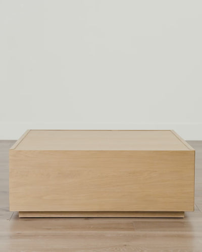 The Bentley Coffee Table is a minimalist, square-shaped design in light oak, featuring clean lines and a solid, box-like look. Perfect for modern spaces, it sits beautifully on wooden floors against plain white walls, by Vendixs