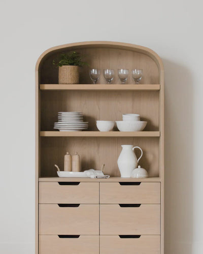Designed with attention to shape, the Burnham Cabinet is crafted from oak in an arched shape that adds soft, inviting lines to the dining room. With two adjustable shelves for open storage or styling and six drawers for concealed storage, its airy design elevates and organizes even your most casual gatherings.