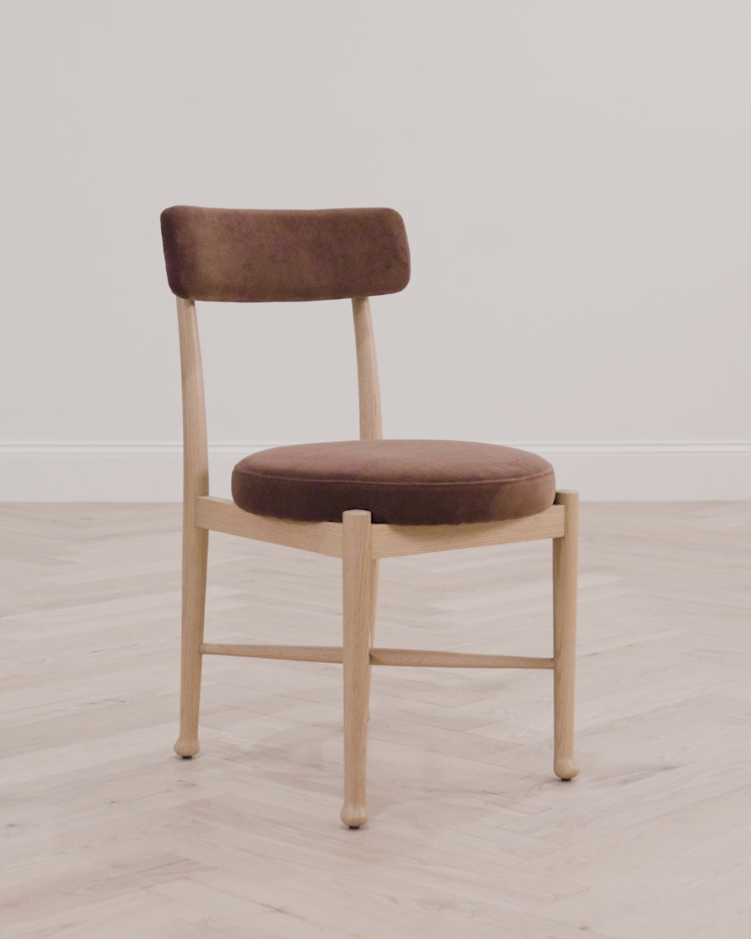 Artfully designed with a solid white oak frame, the Garance Dining Chair has a pitch in its backrest for comfortable seating. In either a parchment crypton or a pecan performance velvet, the upholstered dining chair has a timeless appeal with its curved ball foot and round seat.