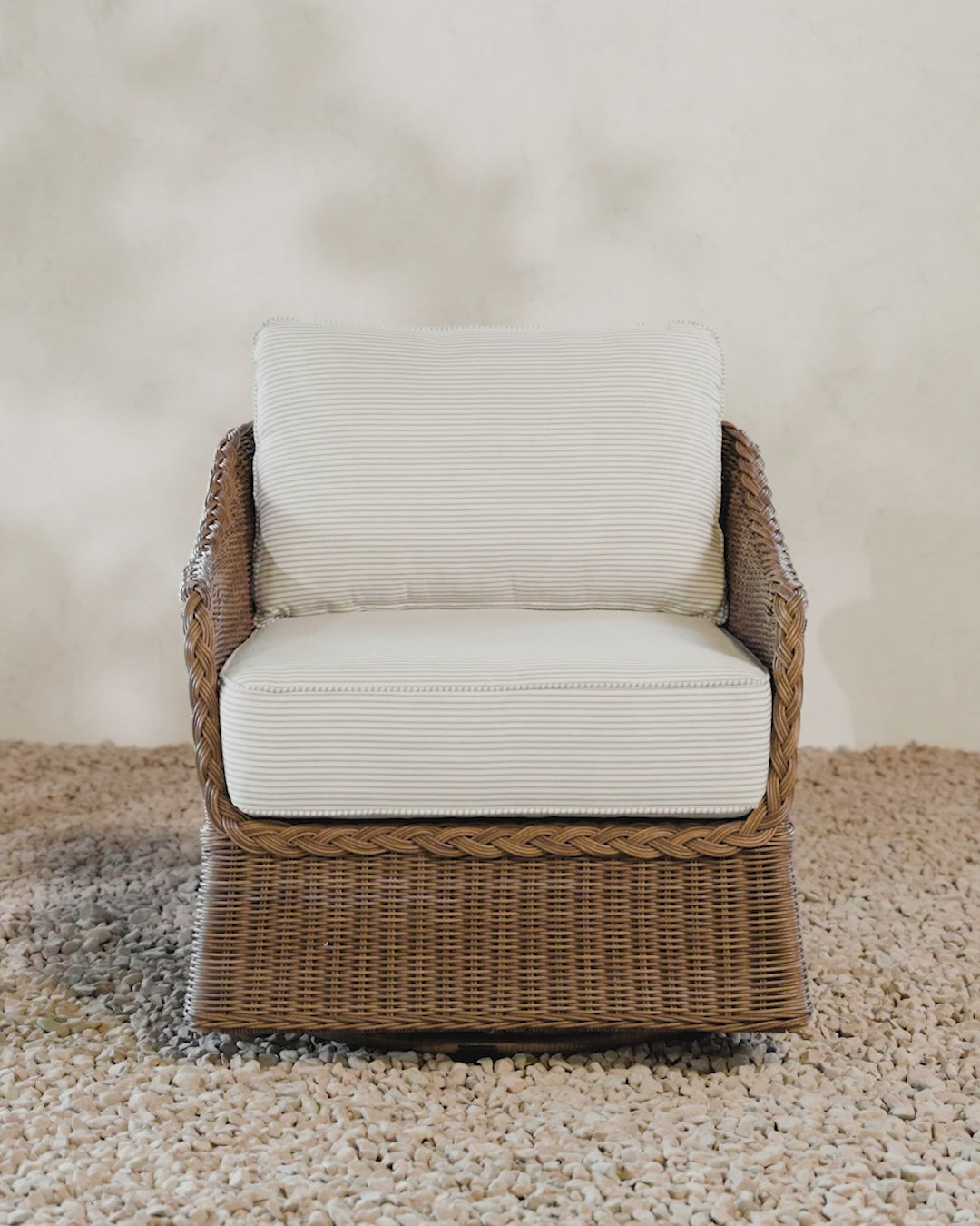 Crafted from woven wicker around an elegant metal frame and a hidden 360 swivel base, the Haviland Outdoor Swivel Lounge Chair offers organic aesthetic and weather resistance to outdoor lounging. Complete with a boxed seat cushion and a knife edged back cushion, we designed this outdoor wicker swivel lounge chair to bring enduring comfort and beauty to your outdoor spaces.