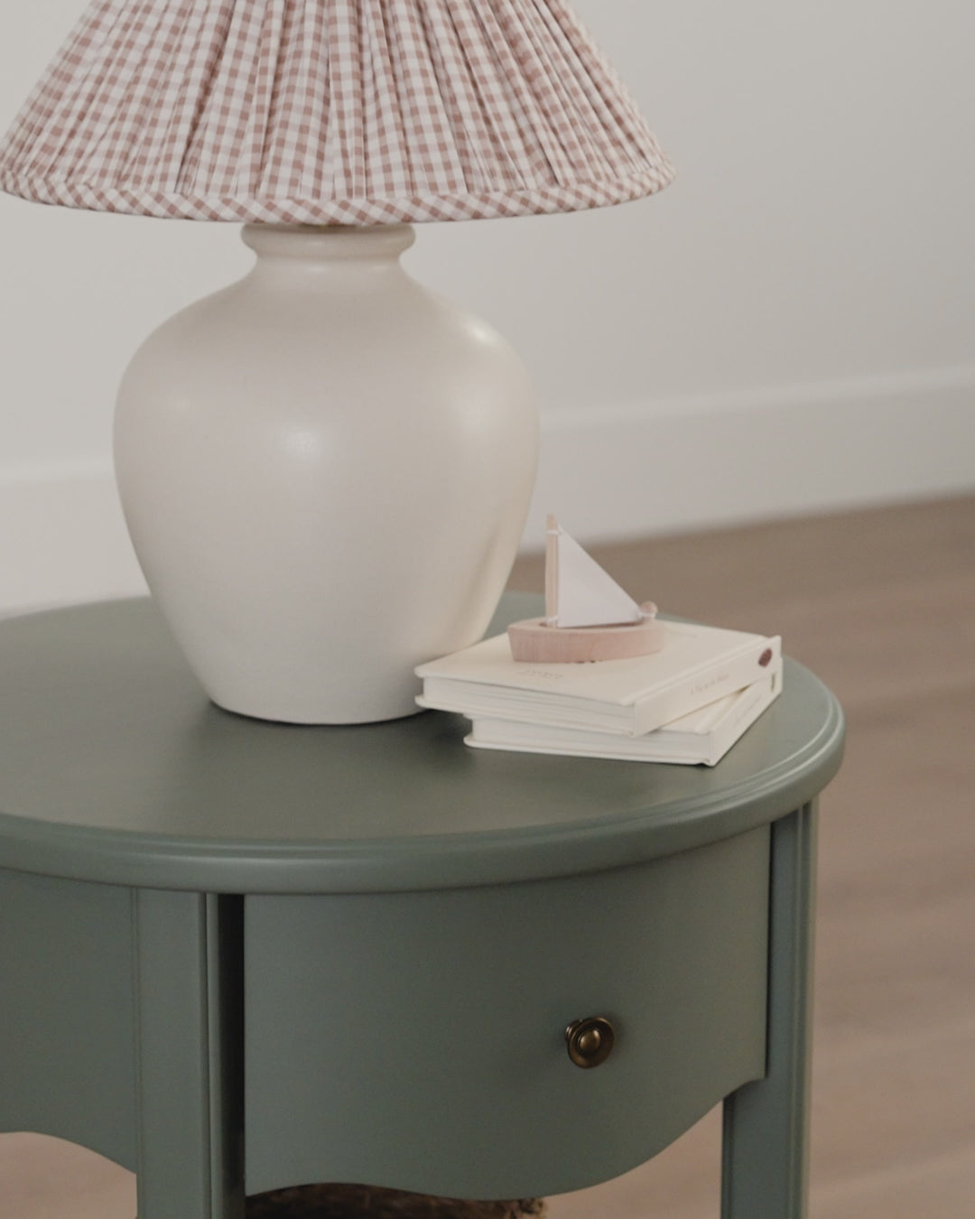 A green Liberty Nightstand holds a beige lamp with a striped shade, a round photo frame, and stacked books. GREENGUARD Gold Certified, this table sits beside a bed against a floral and paneled wall, by Vendixs