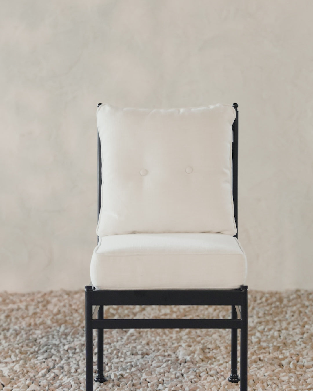 Exuding a sense of refined luxury, we designed our Pomeroy Outdoor Dining Chair with style and resilient materiality in mind. The intricately detailed powder-coated steel frame is crafted with a decorative yet sturdy leg base and ball finials on the back. Upholstered in our Pasadena White indoor/outdoor performance fabric, it features knife edge cushions, a double button tufted back, and a box cushion seat with piping details. Offering timeless style, comfort, and durability, it brings an enduring elegance to your indoor or outdoor dining experience.