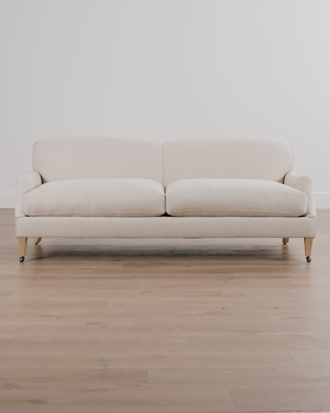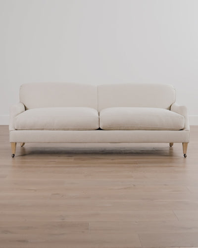 Our Rowley Sofa 85" reimagines traditional design with its subtly curved back and arm design and tapered maple legs with brass casters. Featuring plush cushions with a relaxed yet sturdy feel, this sofa is entirely hand-crafted. Customize this made-to-order piece with an array of high-quality fabric choices to personalize your space.