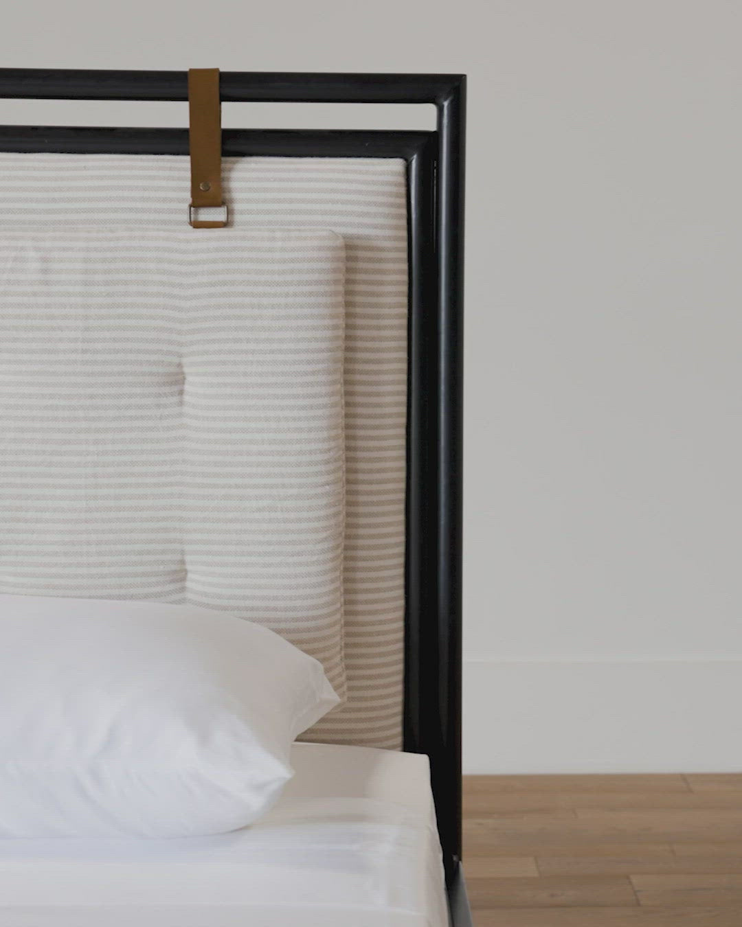 The Sutherland Twin Bed brings an industrial yet cozy style to the bedroom. A padded, raised gray headboard gives dimension to the piece, with leather details that warm the palette. Held in a nuanced, black-metal frame that gives layers to this stunning bed, the Sutherland Bed brings design detail and warmth to elevate the style of any bedroom space.